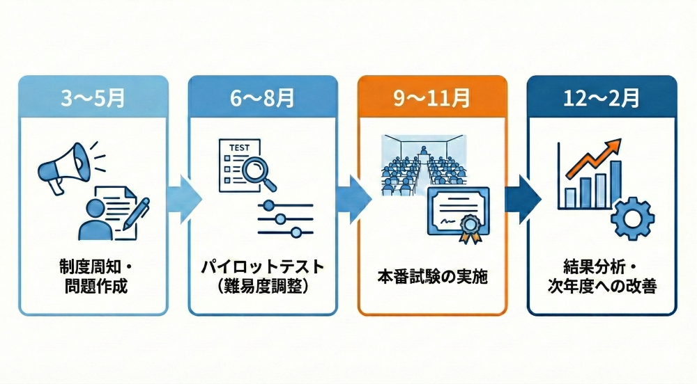 導入初年度の場合、春に問題作成と周知をスタートし、夏頃にパイロットテスト、その結果を踏まえて秋から本格実施といった流れを想定する企業が多いようです。年末や年度末に集計や評価を行い、次年度の試験内容に改善を反映すると、制度が少しずつ成熟していきます。