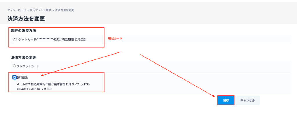 4.変更したい決済方法を選択し、「保存」をクリックする