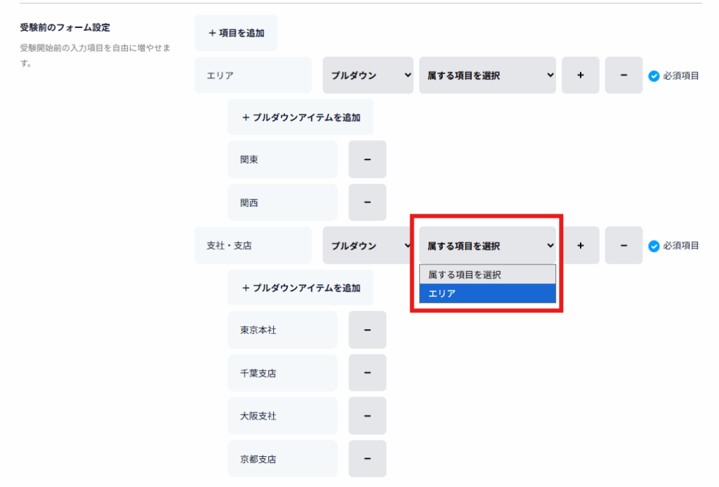例えば「エリア」と「支社・支店」の2つのプルダウンを設定した場合、「エリア」で「関東」を選ぶと、「支社・支店」には東京本社、千葉支社など、関東エリアの拠点のみが表示されます。従来のようにすべての拠点から選ぶ必要がなくなり、受験者は迷わずスムーズに入力できます。