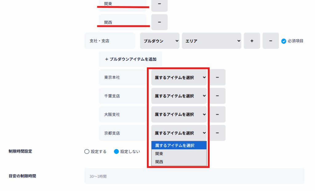 3. 下位プルダウン項目のアイテムの右側に表示される「属するアイテムを選択」から、紐づける上位アイテムを設定